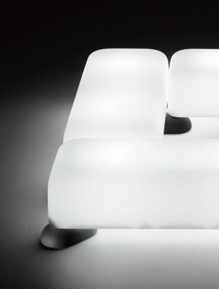 大きな座面のベンチ「モモ・ベンチ」は、脱着式の脚に最大の特長があります。 脚はジョイントの役割も兼ね備え、ベンチ同士をつなげて どのようなフォーメーションでも自由に作り出すことができます。 樹脂製デザイン家具「ポリファニチュア」のライト付きモデルは、 その佇まいに「光る家具のインパクト」を覚えるか、 「柔らかな光に包まれる優しさ」を感じるか、その印象は多彩で すべては見る人に委ねられるライティングオブジェです。