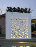 イタリア・BYSTEEL社の高級アルミ製デザイナーズプランター「ブルーム」。幅118cmの大型サイズで、店舗やホテルのパーティション・目隠しに最適です。最新レーザーカットが施された独創的フォルムは、錆に強く屋外・屋内を問わず空間を格上げします。