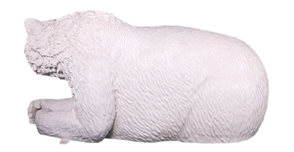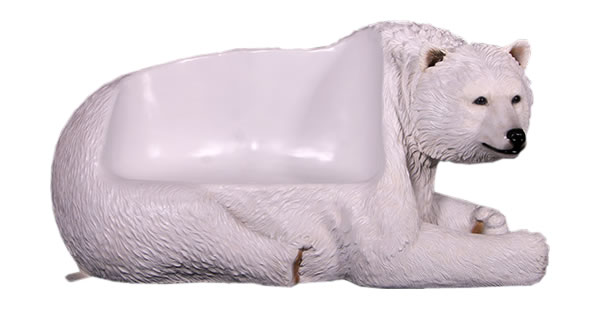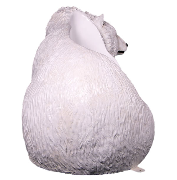 リアルなつくりのシロクマのベンチ(オブジェ)です。樹脂製だから軽くて丈夫で、永くお楽しみいただける熊(くま)の置物です。