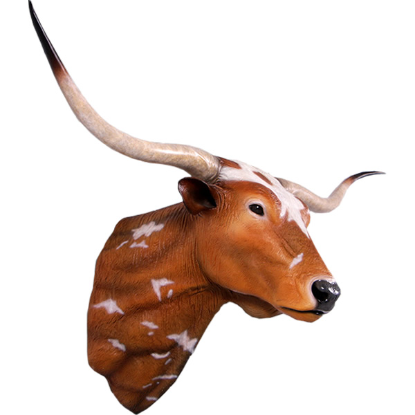 迫力あるテキサスロングホーンの壁掛けオブジェです。実物の剥製ようなリアルなつくりとなっていて、しかも樹脂製だから軽くて丈夫で、永くお楽しみいただけるウシの置物(インテリア)です。