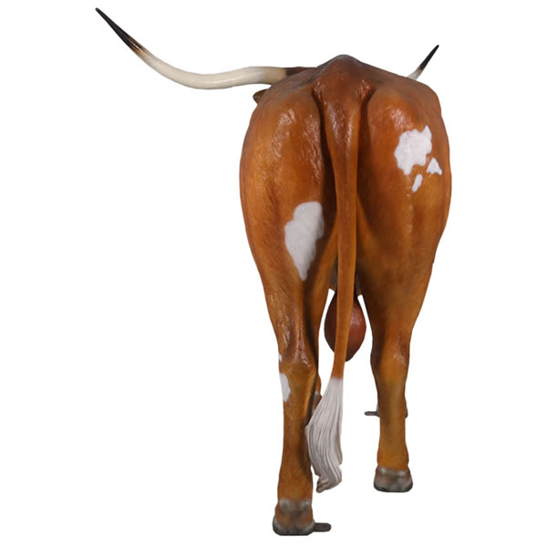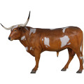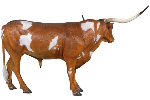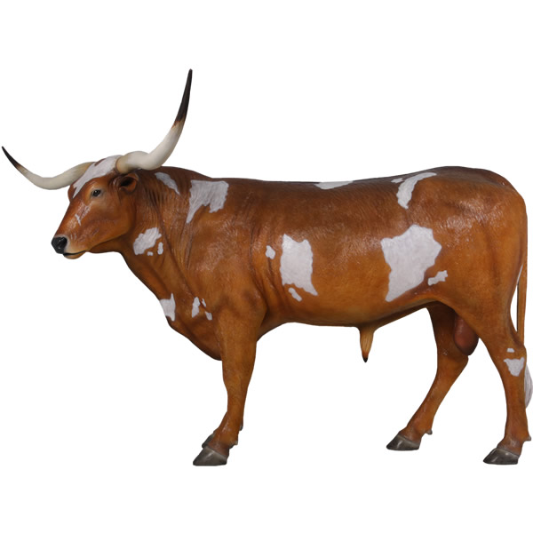 テキサスロングホーンのオブジェです。長い角が特徴の牛が実物大でリアルなつくりとなっていて、しかも樹脂製だから軽くて丈夫で、永くお楽しみいただける置物です。