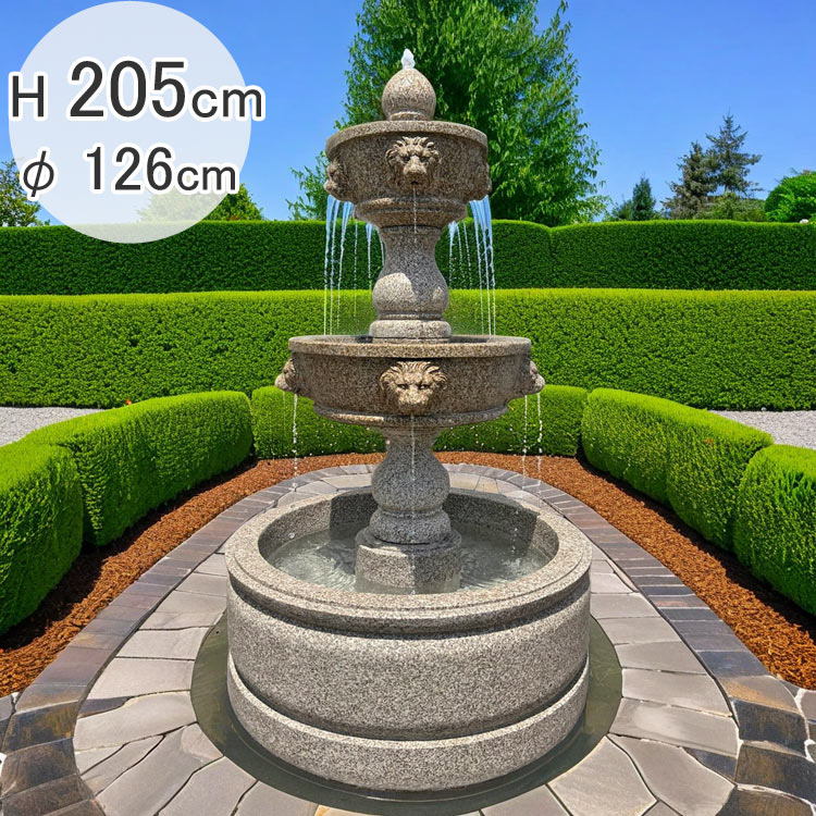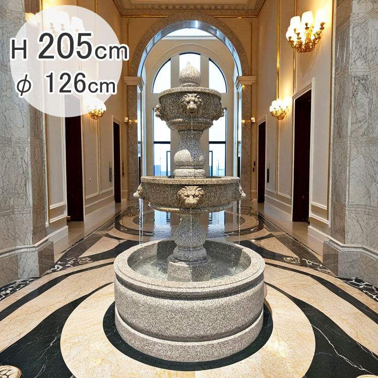 天然石彫刻「ライオン三段噴水」は、迫力ある三段式のウォーターフォール噴水です。ライオンモチーフの彫刻が噴水の流れとともに庭園やエントランス空間に優雅な存在感を演出します。