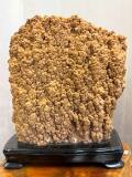 乳白色から柔らかな飴色へと変化する豊かな色彩は、鍾乳石に含まれるミネラル分が長い年月をかけて生み出したもの。玄関のニッチや応接室、床の間などに設置すれば、その場に凛とした品格が漂います。背後の光を透過させるような繊細な結晶層は、ライティングによってさらに幻想的な表情を見せてくれます。付属の天然木台座が、その精緻な姿をさらに格調高く引き立てます。