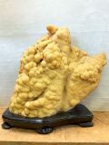 50cmに近いしっかりとした高さがあるため、床の間や玄関、応接室の飾り棚などに設置した際、空間全体の品格を一段と高めてくれます。複雑な表面の凹凸に光を当てることで生まれる陰影は、数万年前の洞窟の静寂を運んでくるかのようです。付属の天然木台座が、その精緻な姿を格調高く引き立てます。