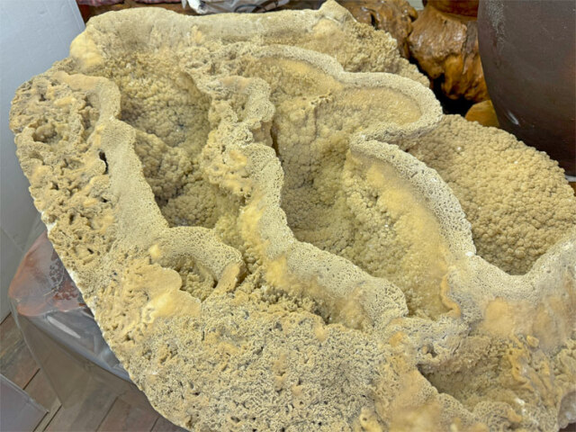 【サイズ】約1m12cm×約84cm 高さ(厚さ)約20cm。【悠久の時が創った大判の至宝】希少な天然鍾乳石 49(m-sn0049)。幅約112cm、奥行約84cmという広大なスケール感が魅力です。数万年の歳月を経て形成された地球の芸術品を、群馬県前橋市の展示場で実際にご覧いただけます。繊細な一点物のため直接引き取りを推奨しております。実物の迫力をぜひ「ガーデンアート増樹」にてお確かめください。