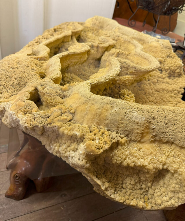 これほどまでに横幅のある鍾乳石は珍しく、和風庭園の景石としてはもちろん、建築空間のアイキャッチや衝立のような装飾としても最適です。見る角度によって複雑に変化する表情は、飽きることのない自然美の極致と言えるでしょう。