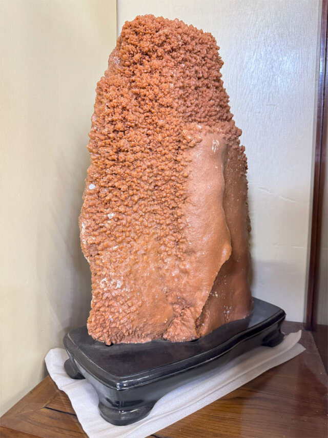 炭酸カルシウムとミネラル成分が織りなす独自の表情は、一つとして同じものは存在しません。室内の飾り石や衝立としてのインテリア利用はもちろん、和風庭園や坪庭の景石としても、その場の空気を凛と引き締めます。付属の天然木台座が、その美しさをより一層引き立てます。